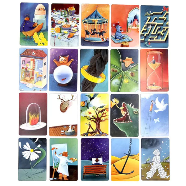 ¿Cómo lo hacemos? cada jugador tiene 6 cartas en la mano. Por turnos, el "cuentacuentos" elige una de sus cartas, y dice su pista. Los demás deben buscar entre sus propias cartas la que más se adecúe a la descripción/cuento/sonido/canción que acaba de decir el cuentacuentos. Se mezclan y se posicionan alrededor del tablero, dejándose ver a los participantes