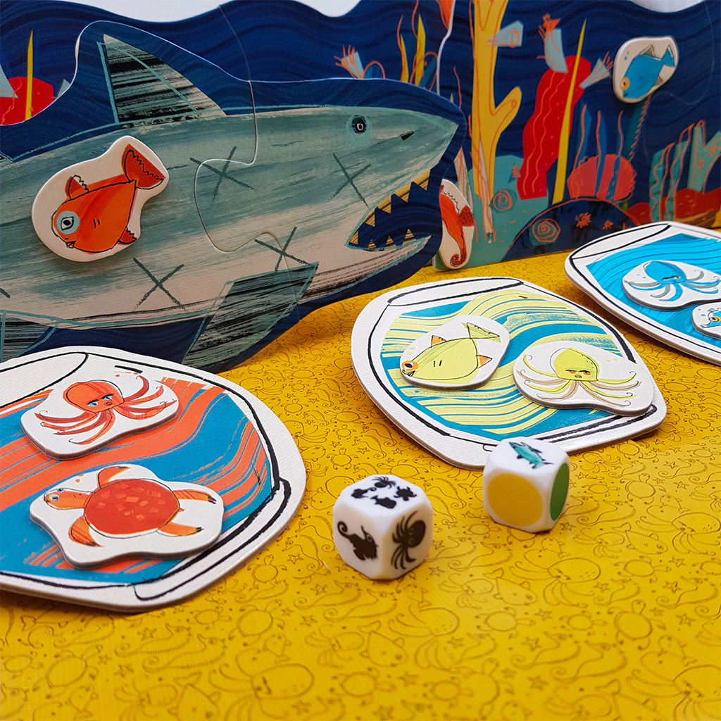 Tenemos cuatro peceras llenas de animales separados por colores y debemos liberalos al océano. ¡Pero ojo! ¡Un tiburón anda al acecho! Tiramos los dados y éstos nos indican qué animal y color podemos liberar al océano o dejar en la panza del tiburón, según la suerte. ¡Pero entre todos podemos salvar a los animales! Si salen 2 tiburones, todos quedan libres. Un juego de mesa simple y didáctico para que lo más chicos aprendan a ser pacientes, a seguir reglas y a cooperar con el otro.