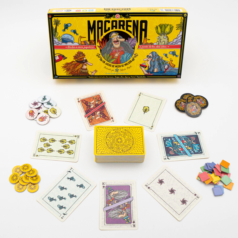 La Macarena es un juego de cartas para grandes y chicos, en donde se deberán recolectar elementos para canjearlos por amuletos y convertirse en el próximo aprendiz de La Macarena. En cada mano se disputan los 4 elementos, que se ganarán coleccionando cartas al jugar en los 7 pozos dispuestos alrededor del mazo.