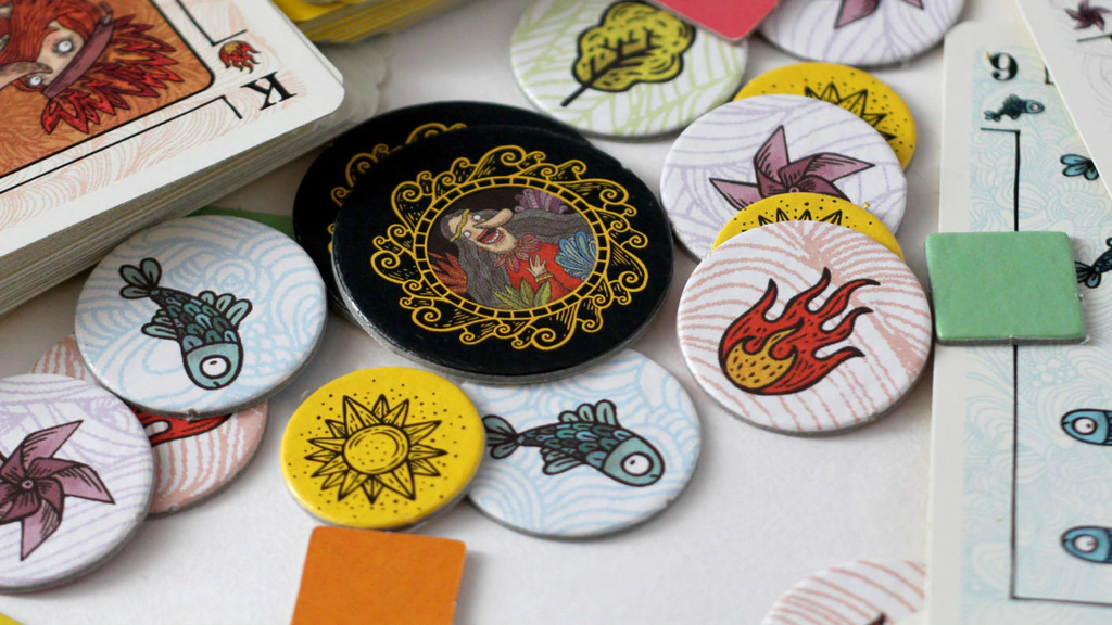 Contenido: 2 mazos de 52 cartas / 35 Macas / 8 amuletos / 24 fichas de elementos / 15 monedas / reglamento