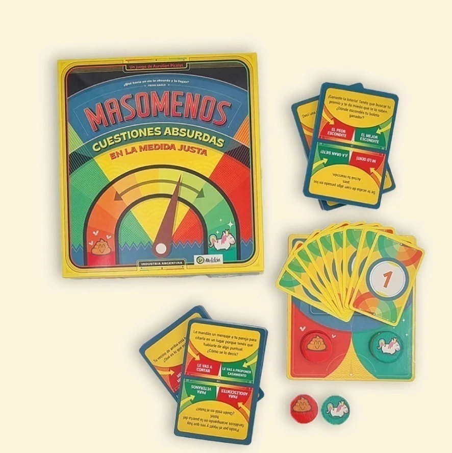 MASOMENOS un juego cooperativo de socialización de lo más entretenido, donde deberán ubicar CUESTIONES ABSURDAS en el orden correcto