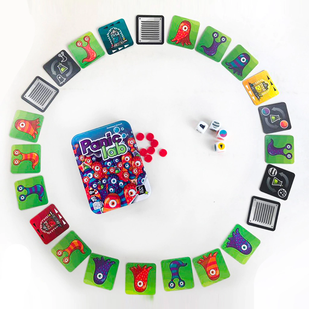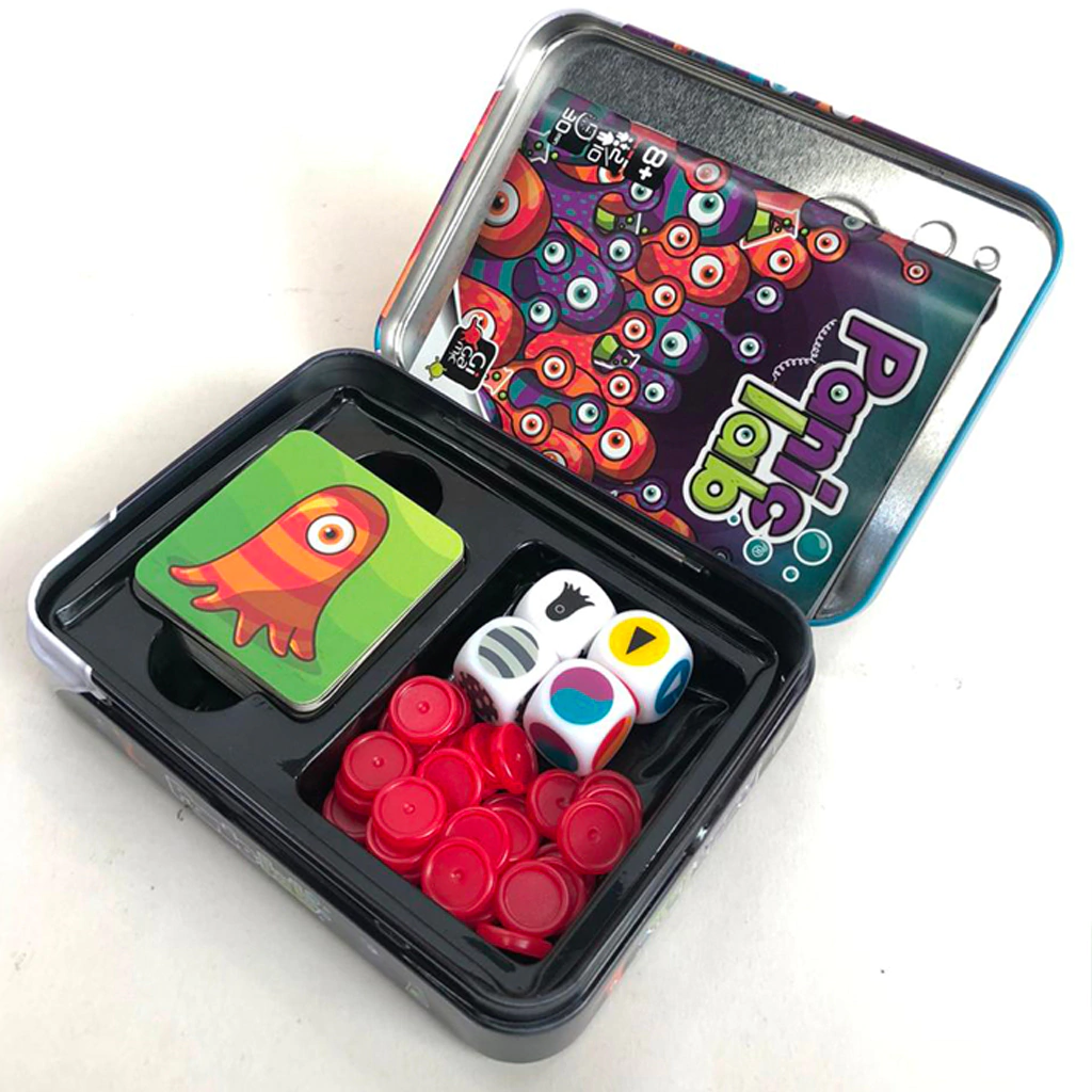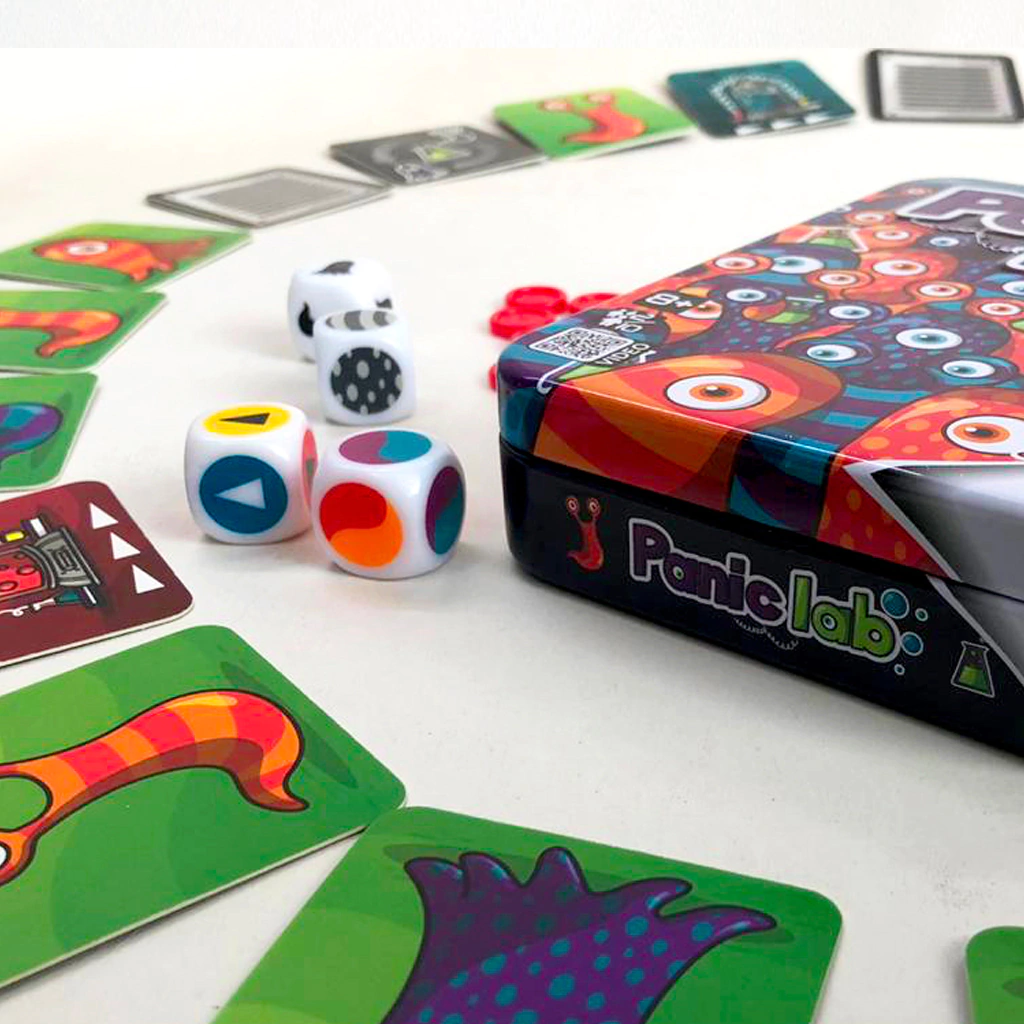 Panic Lab es un juego de mesa en el que tenemos que cuidar nuestro preciado laboratorio de la fuga de unas amebas. ¡Las amebas se escaparon y están moviéndose para todos lados! ¡Encontalas rápido! En este juego, todos juegan juntos y al mismo tiempo. Tirá el dado que te indicará de qué laboratorio escapó la ameba y como es la ameba escapista. El primer jugador en encontrar la ameba correcta ganará un punto. Pero cuidado, ¡estos pequeños embaucadores no quieren ser atrapados!