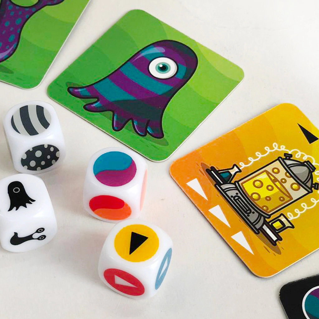 Contenido: 25 cuadrados ilustrados, 4 dados muy especiales, 30 fichas de juego, reglas del juego.