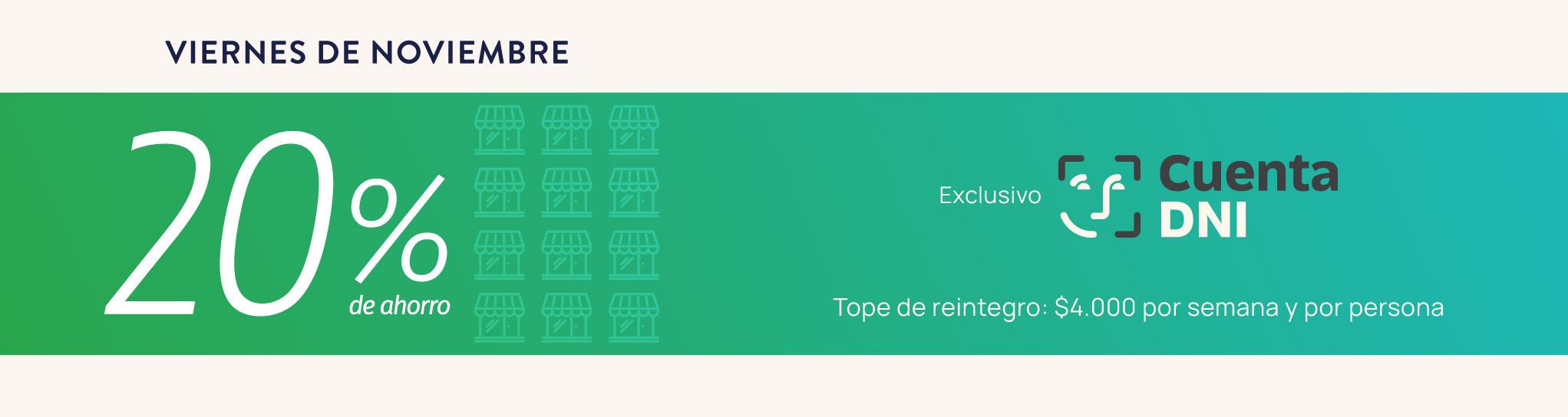 Tenés 20% de reintegro (Tope de reintegro: $4.000 por semana y por persona) los Viernes del mes de Noviembre en tus compras online abonando con Cuenta DNI. Más abajo podés ver las bases y condiciones.